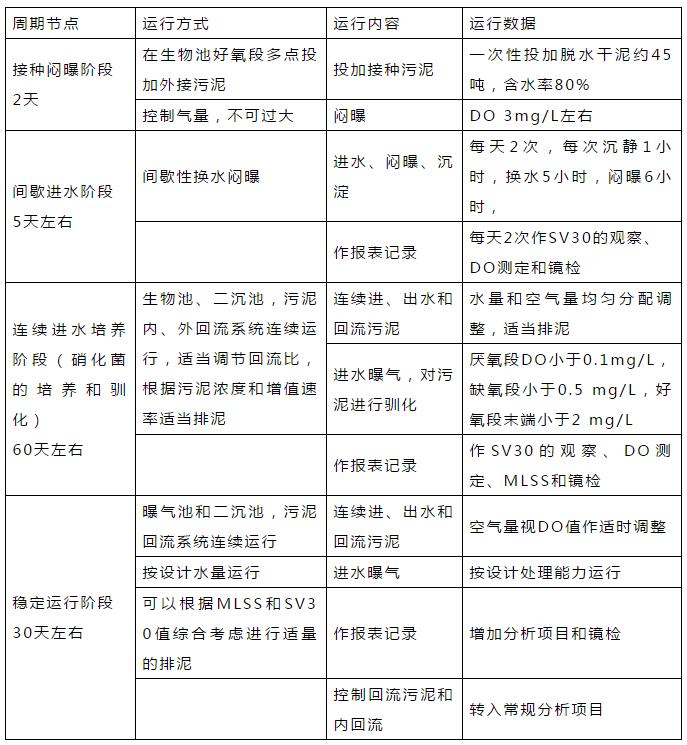 此時(shí)全面確定各項(xiàng)工藝參數(shù),以工藝參數(shù)作為實(shí)際運(yùn)行指導(dǎo),根據(jù)實(shí)際進(jìn)水水量和水質(zhì)情況來來確定合適的工藝控制參數(shù),以保證運(yùn)行的正常進(jìn)行和使出水水質(zhì)達(dá)標(biāo)的的同時(shí)盡可能降低能耗。并通過馴化實(shí)現(xiàn)使硝化菌與聚磷菌共存的生態(tài)系統(tǒng)達(dá)到平衡,確保出水水質(zhì)。