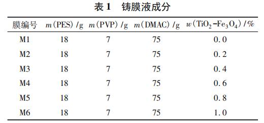 采用浸沒沉淀相轉化法制備膜,以 TiO2 -Fe3O4 為改性劑進行共混改性,設計實驗配比,如表 1所示。