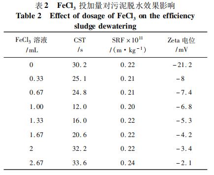 2.2 PAM 投加比為 1 /6 時,FeCl3 溶液投加量對污泥脫水性能的影響見表 2,先加入的陽離子 PAM 對污泥進行電荷中和作用,使污泥膠體脫穩。在開始階段,一方面投加 FeCl3 發揮絮凝的作用,形成污泥絮團,在此過程中,部分結合水被轉化為自由水,使得污泥中自由水的含量升高;另一方面,由于正電荷的引入也使得 Zeta 電位不斷增大,污泥間的靜電斥力不斷減小,更利于絮體的形成。因此,開始階段污泥表面的 CST 和 SRF 不斷減小,當 FeCl3 投加量為 1 mL 時 CST 和 SRF 達到最小值,分別為12. 0 s、0. 20 × 1011 m /kg。隨后繼續增加 FeCl3 的投加量,反而導致污泥的 CST 與 SRF 回升,但是隨著陽離子的不斷引入,后階段的 Zeta 電位也是呈上升趨勢,此時由于 Fe3 + 與 PAM 中陽離子基團同電相斥,使得污泥顆粒間排斥作用加大,絮體難以凝聚,不利于污泥脫水。從藥劑節省和脫水性能優化兩方面綜合考慮,確定 FeCl3 最佳投加量為每毫升污泥中投加 1 mL。