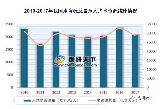 根據國家統計局數據,截至2017年底,我國人均水資源兩位2074.53立方米/人,僅為世界平均水平的1/4,是聯合國13個貧水國之一,特別是北方和部分東部地區人均水資源量嚴重偏低。